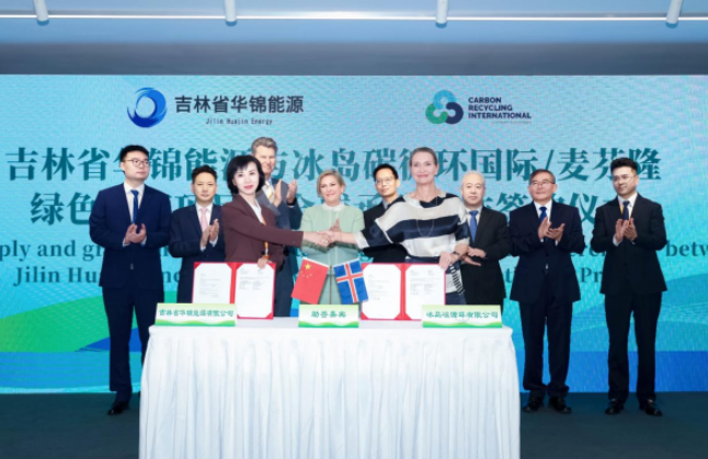 10月16日,正值冰島總統(tǒng)哈德拉?托馬斯多蒂爾訪華期間,2025可持續(xù)全球領(lǐng)導(dǎo)者大會在上海召開,大會主題活動——中國-冰島企業(yè)合作簽約儀式同期舉行,冰島總統(tǒng)哈德拉?托馬斯多蒂爾親臨現(xiàn)場。會上,吉林省華錦能源有限公司與冰島碳循環(huán)國際(CRI)/麥芬隆完成綠色甲醇項目暨全球承購合作簽約;中環(huán)新能源控股集團(tuán)旗下中環(huán)新能源創(chuàng)新研究院有限公司,與吉林省華錦能源有限公司簽署戰(zhàn)略合作協(xié)議。