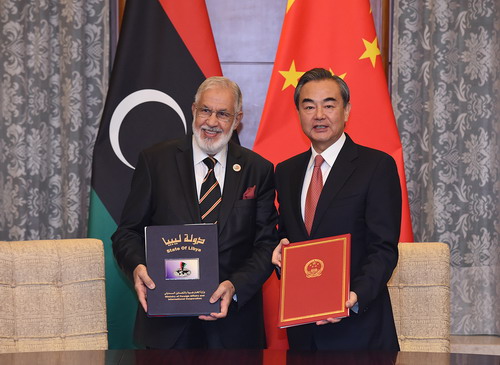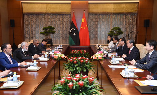 2018年7月11日,國務委員兼外交部長王毅在北京同來華出席中國−阿拉伯國家合作論壇第八屆部長級會議的利比亞團結政府外交部長希亞萊舉行會談。