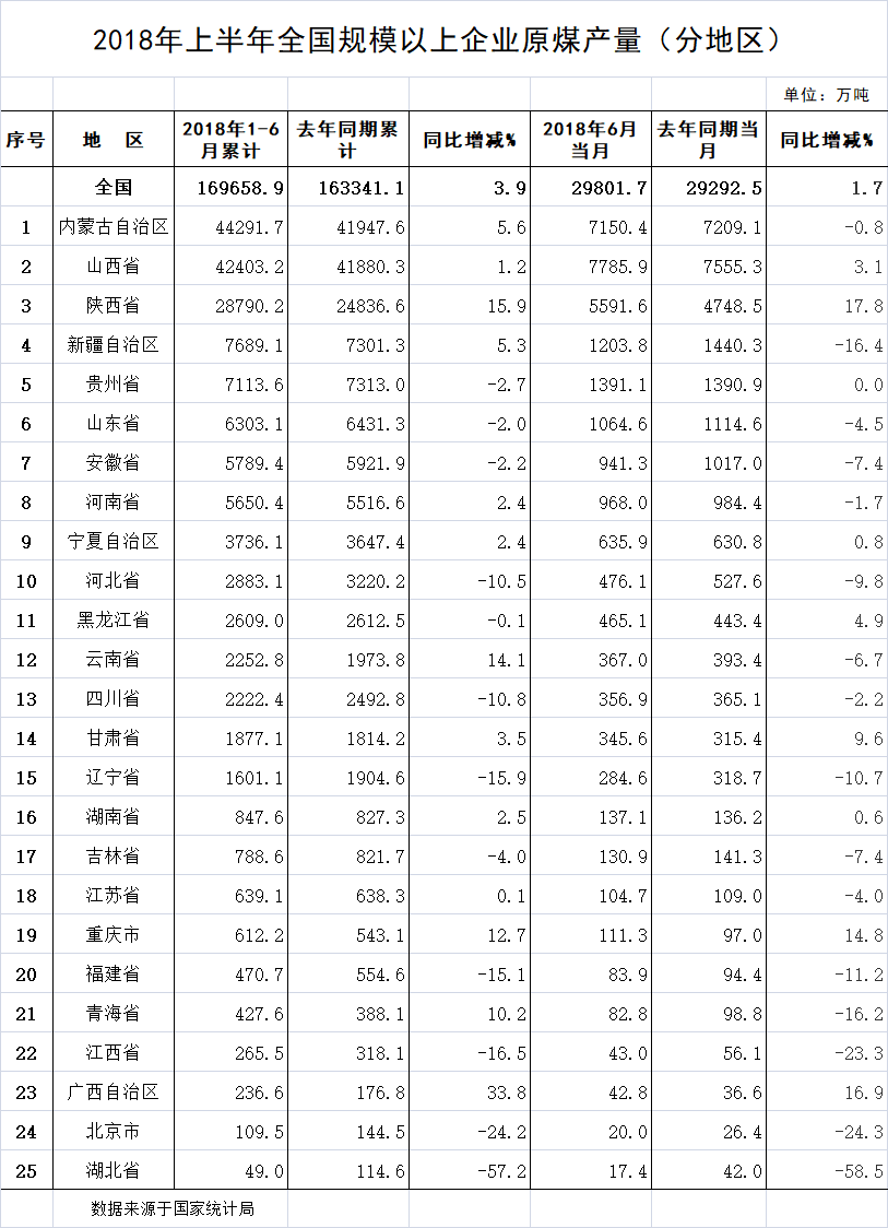 2018年上半年全國各省區原煤產量排名公布